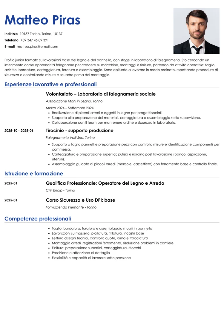 Questi elementi, insieme alle esperienze di stage, alle attività svolte e alle competenze di settore, lo rendono credibile nel ruolo di apprendista falegname, soprattutto per aziende che cercano una risorsa da formare senza dover ripartire completamente da zero.